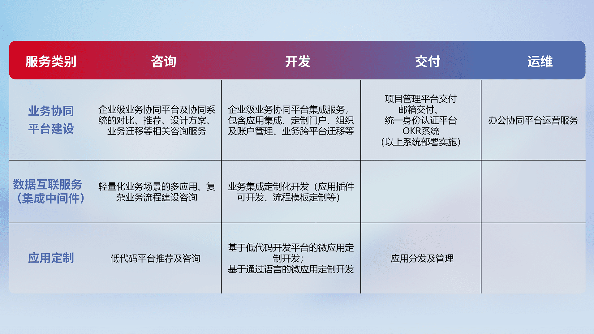 针对钉钉、、、企微、、、IDaas等平台级产品提供产品的规划、、、、方案、、交付、、定制化开发等服务,,,,实现如统一协同办公、、智能客户服务、、混合会议管理、、、、智能数据查询、、、等业务场景,,实现数字化转型。。。。